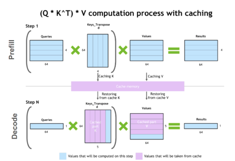 - Decode : 답변 토큰을 하나씩 생성하는 단계입니다. 새 토큰을 만들 때마다 이전 모든 토큰과의 관계를 다시 계산해야 하는데 여기서 최적화의 여지가 생깁니다.